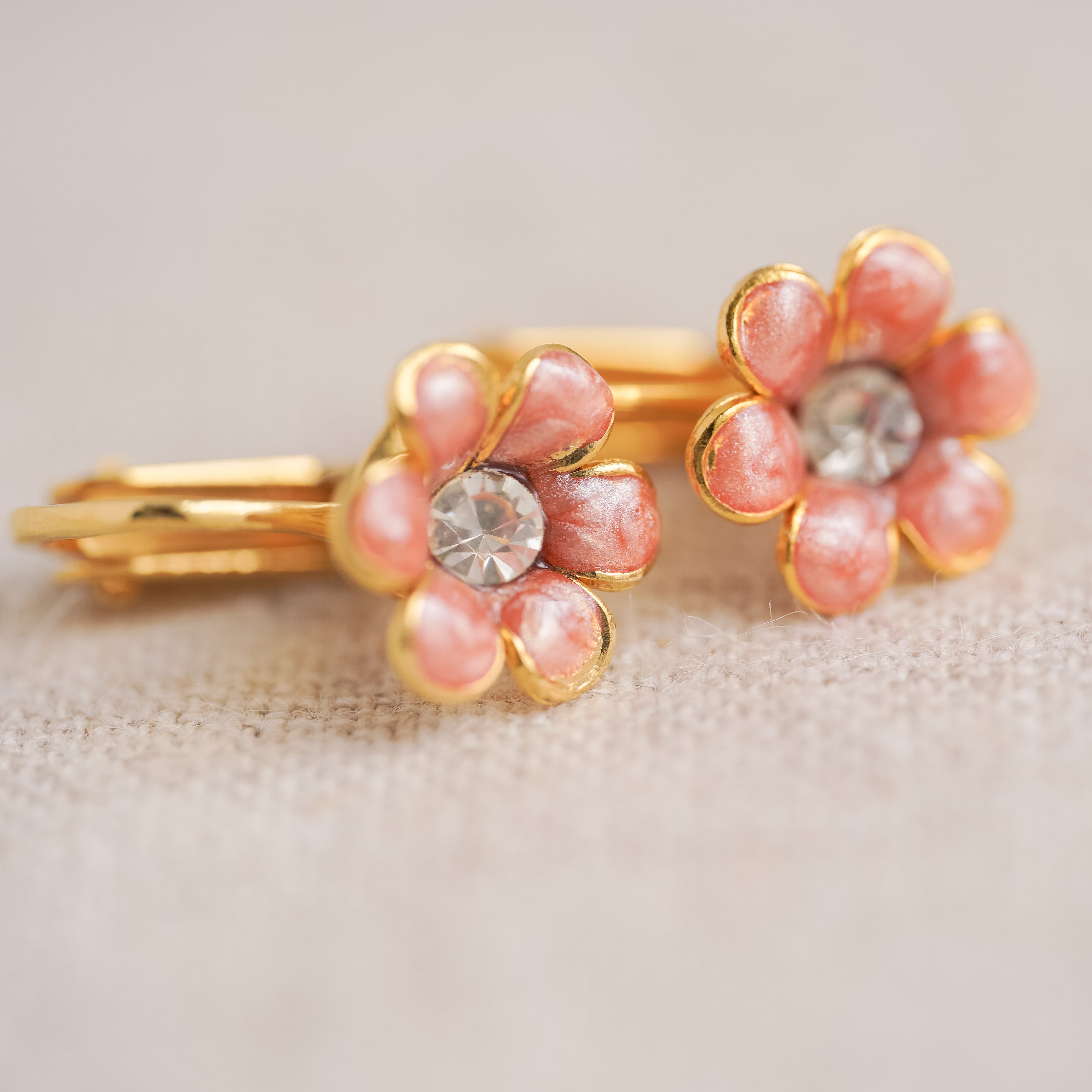 A charming pair of vintage earrings in a classic floral motif. The petals, painted in a delicate apricot-hued enamel, curve gently to create a stylised, three-dimensional silhouette. At the center, a rhinestone radiates a soft, refined sparkle, beautifully framed by the matte tone of rich vintage gold. Together, these elements bring an understated elegance that complements rather than overwhelms.
