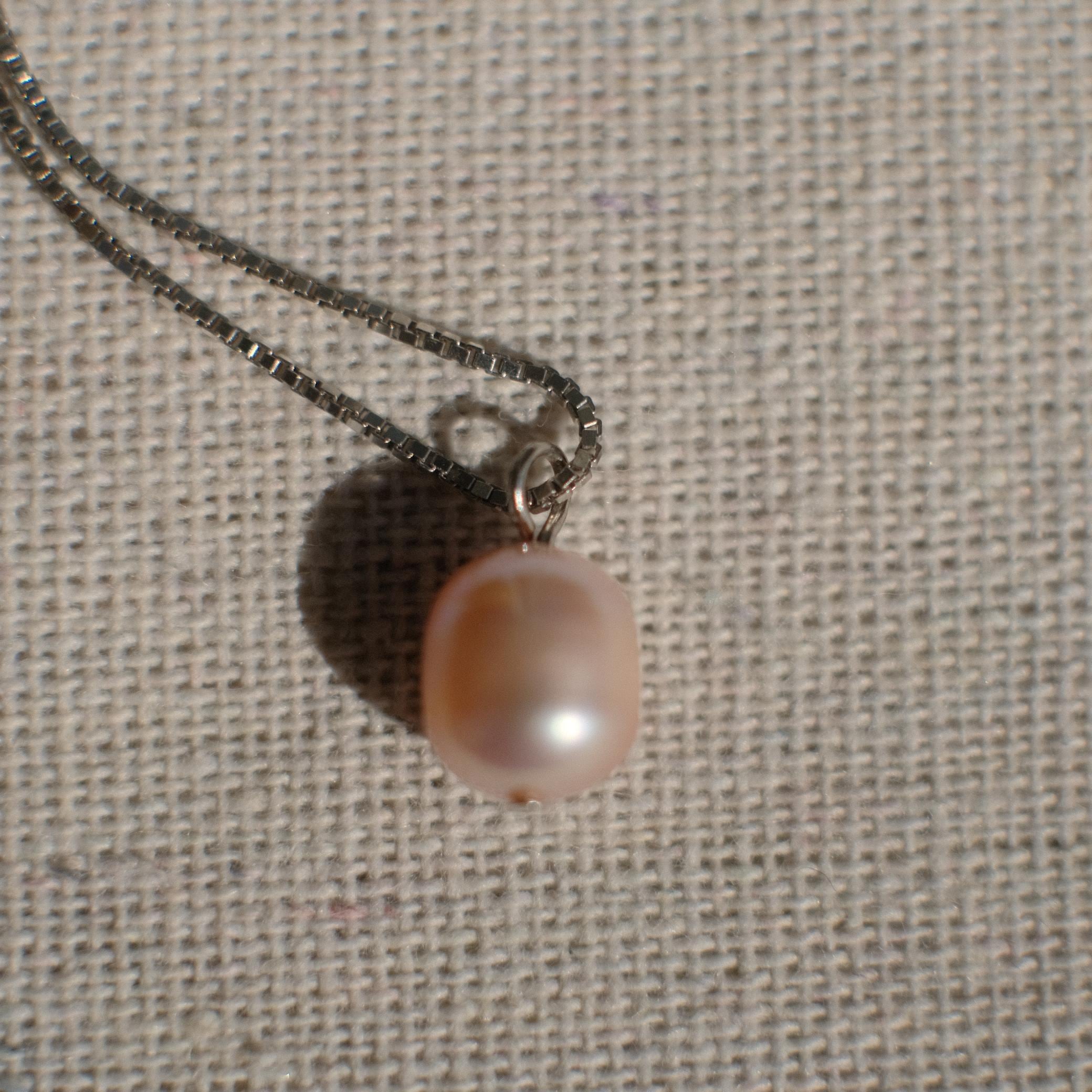 Gentle as a flower petal, “Rose” reveals a tender pink tone that shifts delicately with the light. Set on a sterling silver chain, the vintage baroque pearl glows warmly against the skin, evoking femininity and quiet elegance at once.