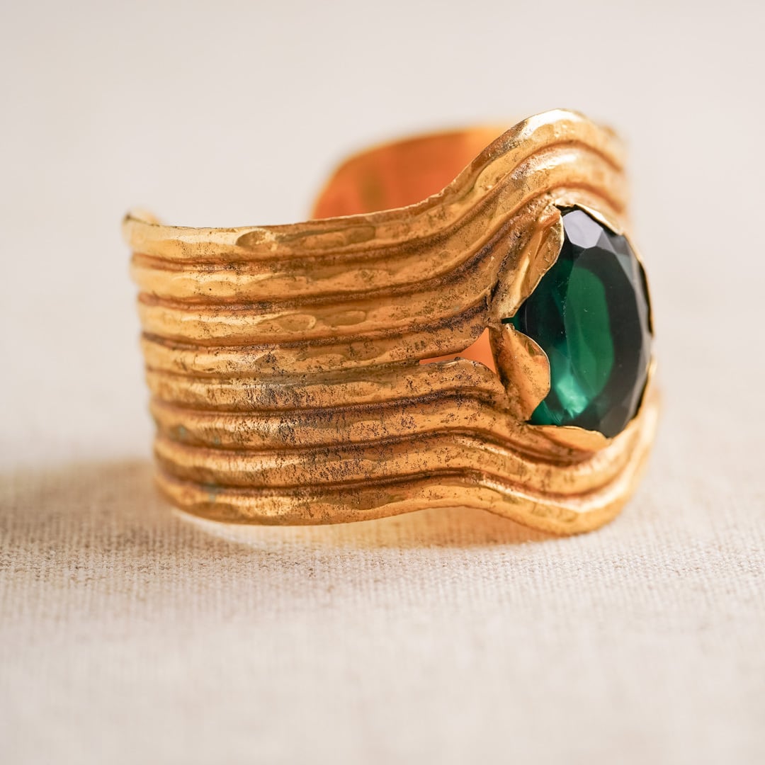 This vintage bangle features sculptural, wave-like layers of gold metal that cradle a striking emerald-green cabochon at the center. Its bold, geometric lines echo the Art Deco aesthetic, while its dramatic scale and artistic flair reflect the expressive design sensibility of the 1970s–80s. The result is a piece that feels less like jewelry and more like wearable art.
