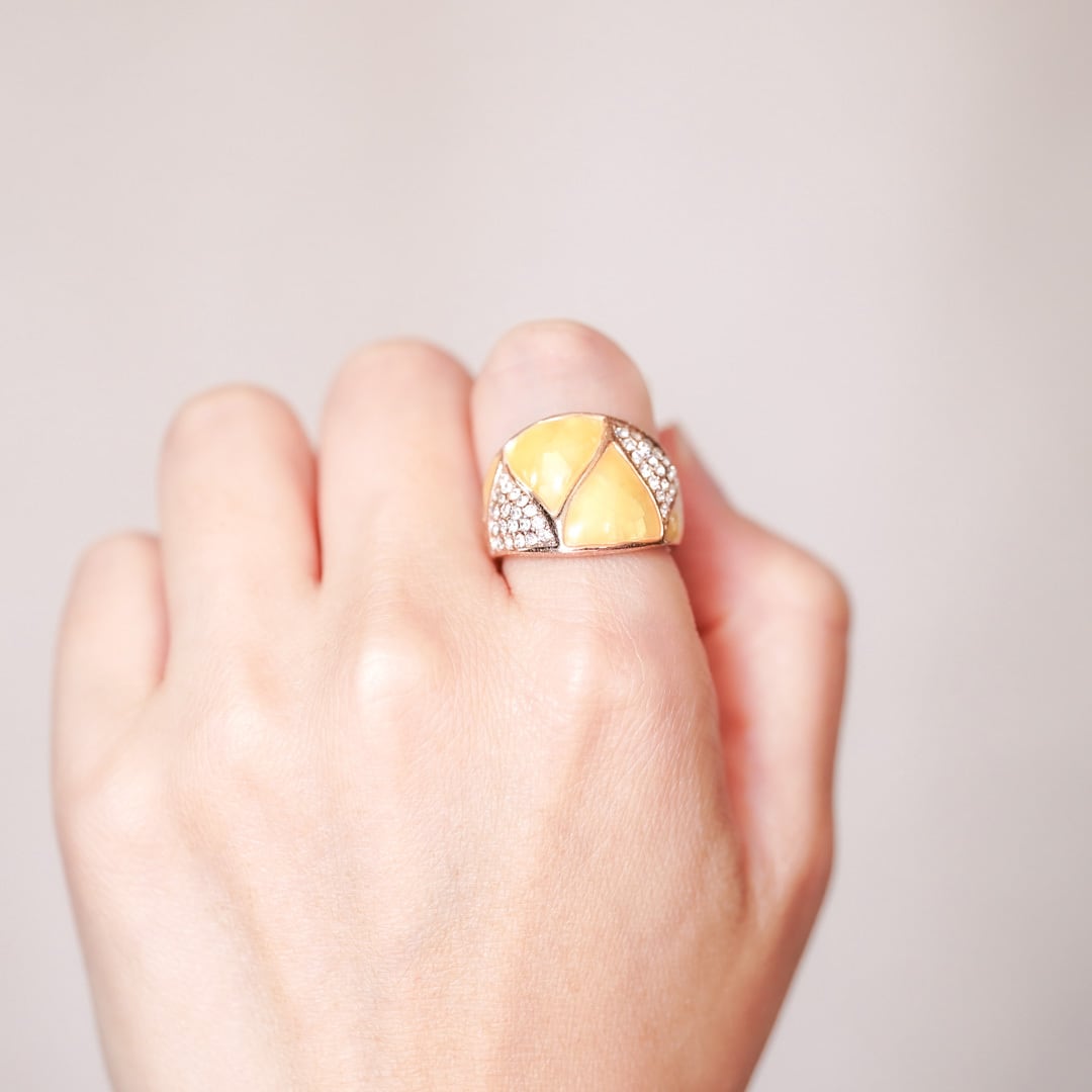 This vintage ring beautifully combines the warmth of sunlit yellow enamel with the sparkling brilliance of rhinestones. Set on a gold-tone metal base, its geometric mosaic-like design feels both artistic and modern, creating a bold yet elegant presence on the hand.