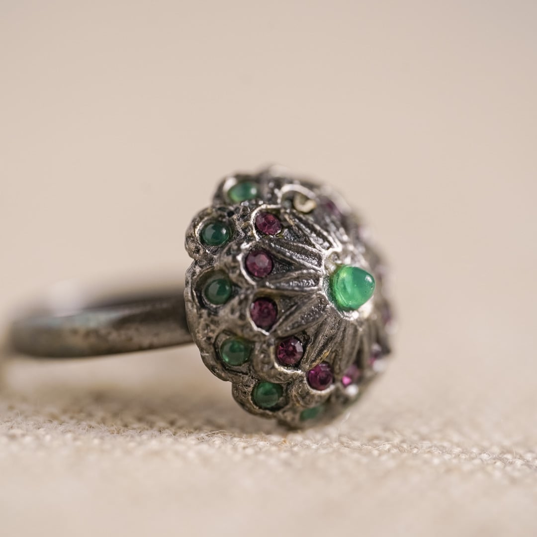 At the center of this vintage ring lies a vivid green stone, surrounded by a radiating pattern of deep wine-red rhinestones. The silver-tone metal base, finely engraved with delicate details, catches the light and creates a subtle play of shadows, evoking the aura of an antique treasure.