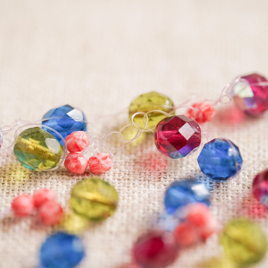 鮮やかなブルー、グリーン、レッドにコーラルピンクのガラスビーズを連ねた、Milly Callegari Italy のヴィンテージロングネックレス。イタリアらしい色彩の遊び心と、ビーズ一粒ごとに施されたファセットカットが光を反射し、軽やかにきらめきます。