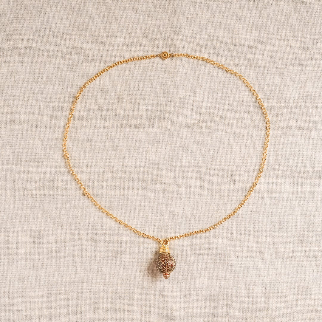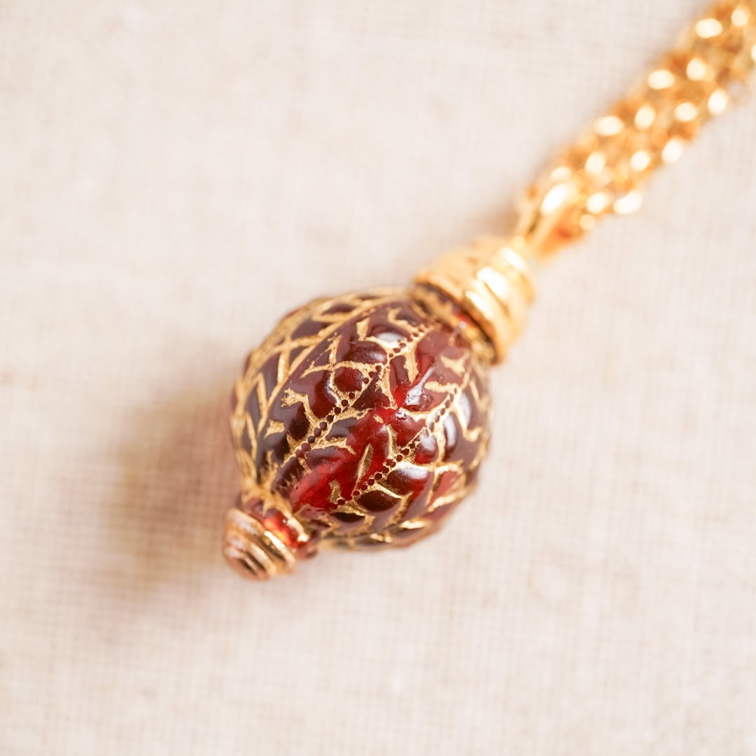 This vintage long necklace features a glass charm in deep red and gold, suspended from a bold gold-metal chain. The contrast between the intricate enamel detailing and the substantial chain creates a look that feels both timelessly classic and strikingly modern.