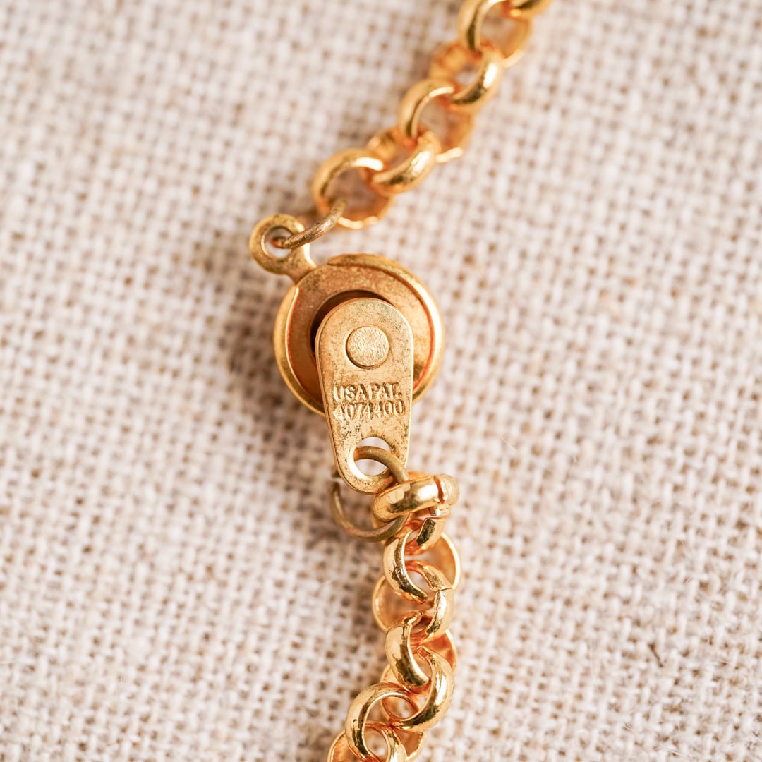 留め具部分には刻印が見られ、ヨーロッパ圏で製作された可能性を示唆するディテール。ブランド特定には至らないものの、丁寧な細工と素材の選び方から、質の高いコスチュームジュエリーとしての背景を感じさせます。