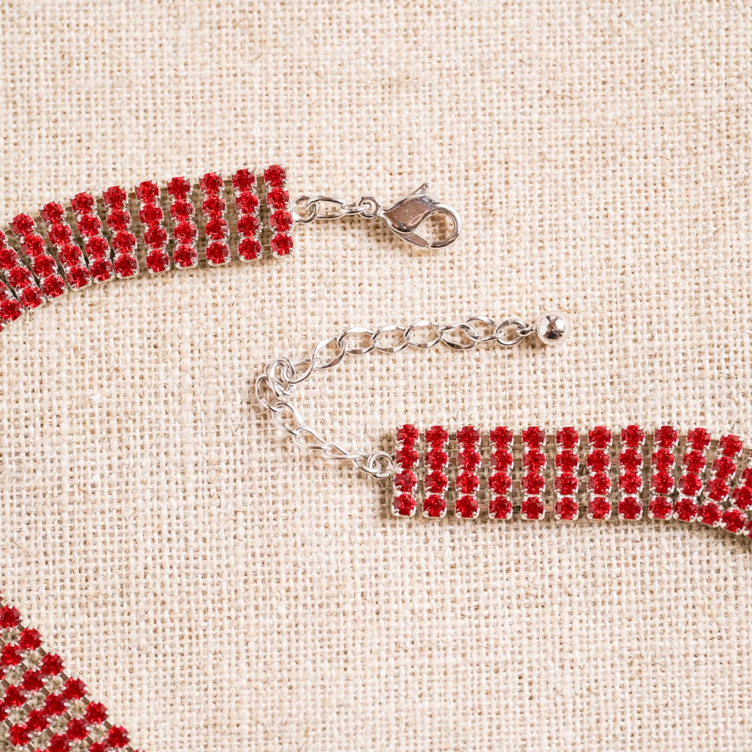 This vintage necklace features a cascade of vivid red rhinestones, designed to sit gracefully like a ribbon tied at the neckline. Each stone catches the light with refined brilliance, bringing both vibrancy and sophistication to your look.