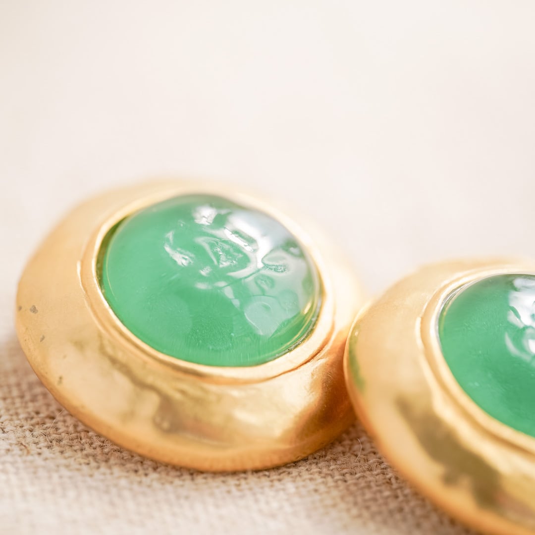 エメラルドグリーンのカボションを、艶やかなゴールドメタルに収めたヴィンテージイヤリング。背面には「CUSHKA」の刻印が入り、1980年代にヨーロッパで人気を博したブランドのオリジナルピースであることを示しています。鮮やかなグリーンとゴールドのコントラストは、時代を超えても色あせない存在感を放ちます。