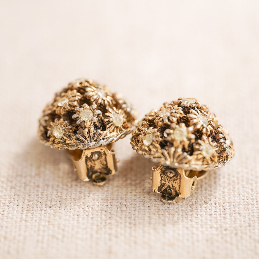 These vintage earrings feature an intricate floral motif, with clusters of tiny blossoms crafted in gold metal. Each petal is delicately detailed, catching the light with a soft shimmer. Despite their bold, domed silhouette, they convey a sense of airy elegance and timeless charm.