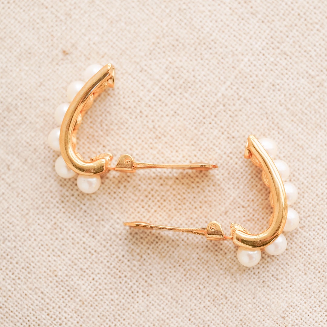 These hoop earrings reinterpret a classic design with an elegant yet slightly edgy twist. Costume pearls are set in a structured gold frame, creating a striking balance between the soft luster of pearls and the sharp, modern lines of the metal.