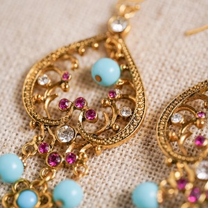 優美なティアドロップ型のフレームに繊細な透かし模様が広がり、ターコイズブルーのビーズとルビー色のガラスストーンが可憐に輝くイヤリング。軽やかに揺れるシルエットは、まるで舞踏の一瞬を閉じ込めたかのような華やぎを纏っています。