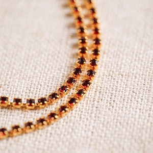 連なるストーンの深みある赤とゴールドのセッティングは、クラシカルでありながらもモードな存在感を放ち、ひと目で視線を惹きつけます。