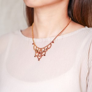 繊細な透かし模様のように編まれたガーネットカラーのガラスストーンが胸元を彩る、チェコスロバキア製ヴィンテージネックレス。