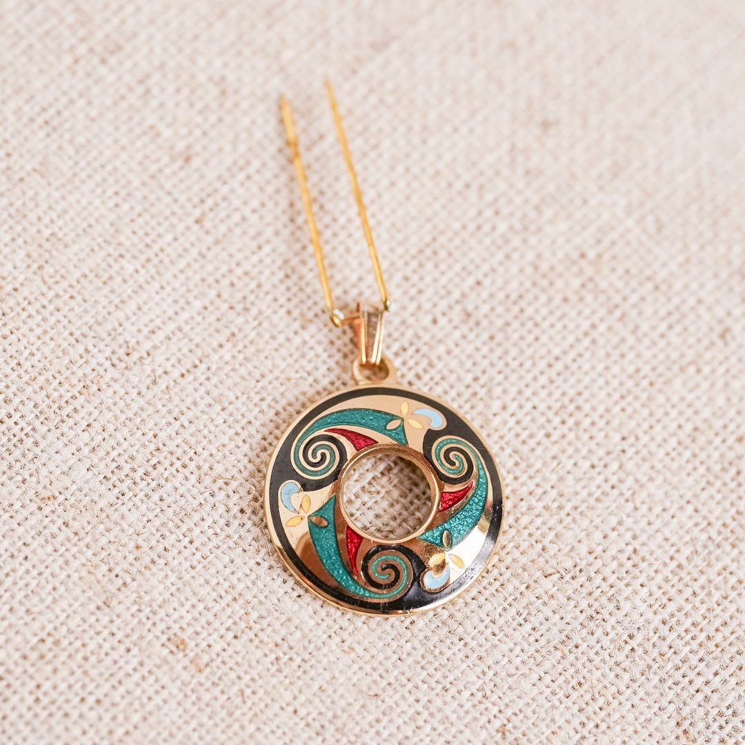 艶やかなエナメルで彩られた円形ブローチ・ペンダントトップ。