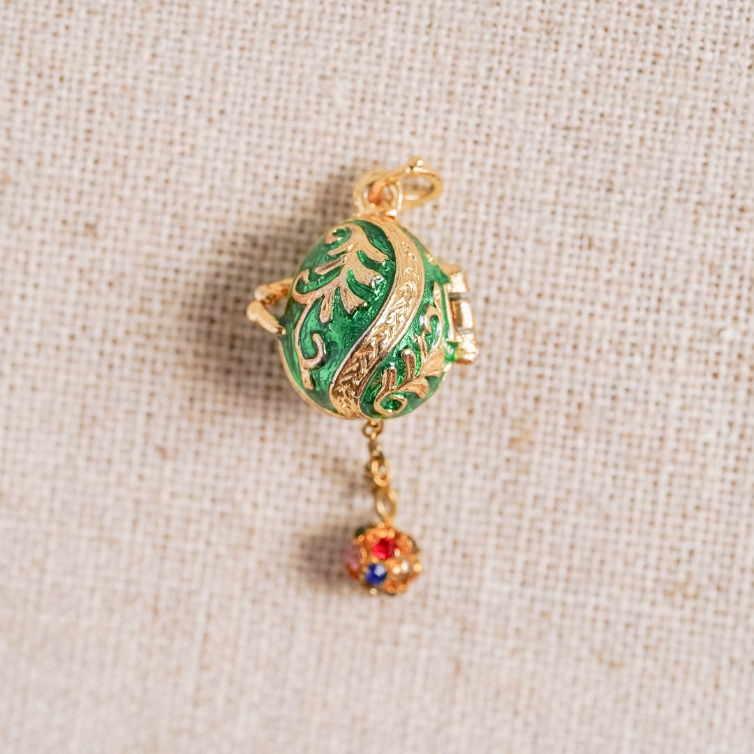 A delicate egg-shaped charm, its surface adorned with deep green enamel and flowing gold accents.