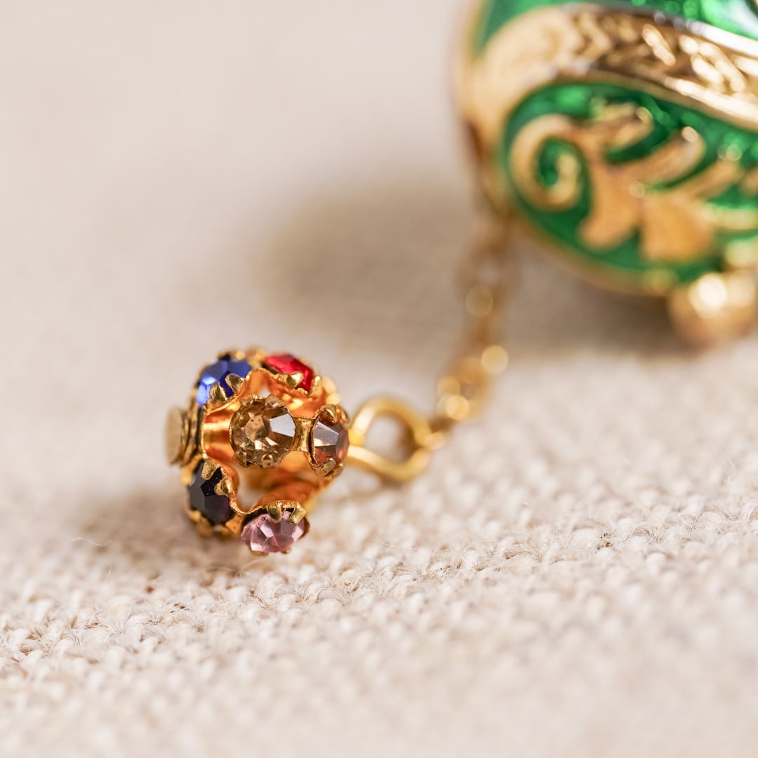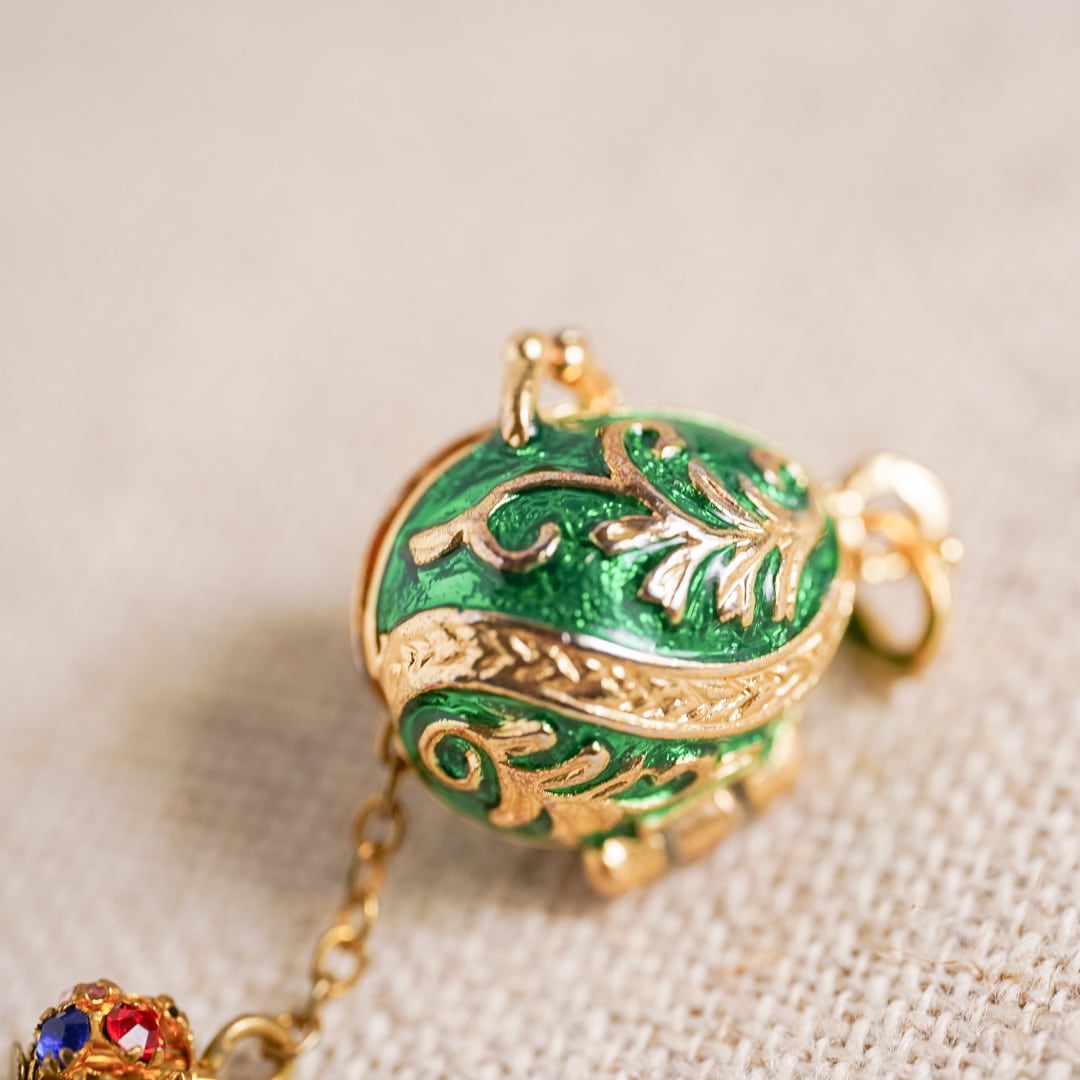 The design recalls the miniature Fabergé eggs of late 19th-century Russia — treasures that carried not only beauty but also stories of tradition and artistry. At its base, a sparkling stone dangles softly, catching the light with each movement and adding a sense of life and brilliance.
