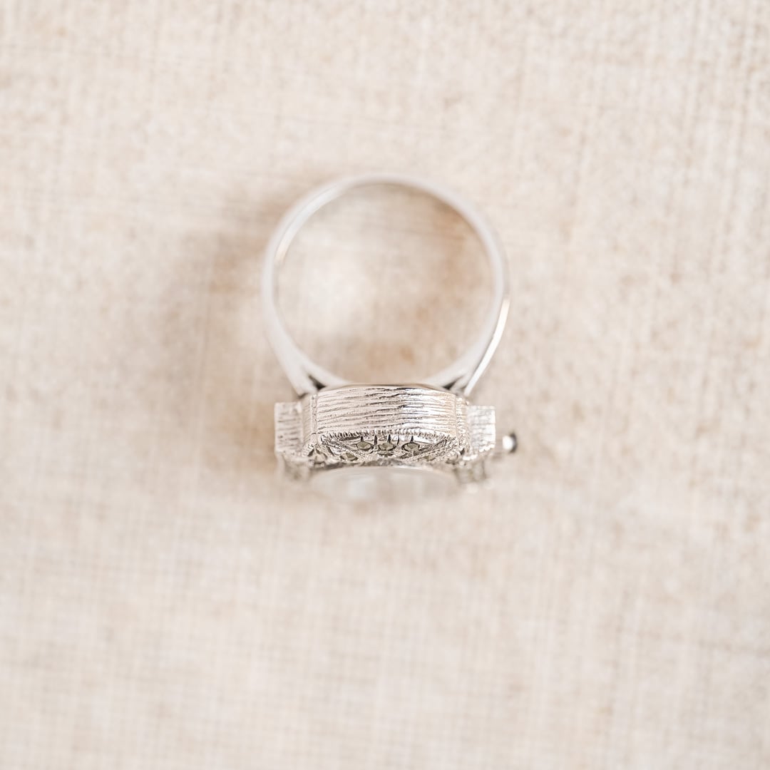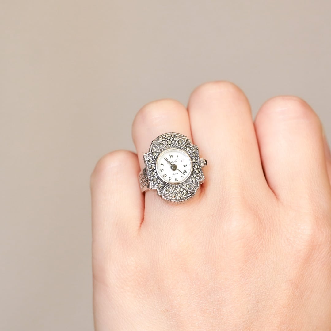 This vintage watch, adorned with delicate marcasite detailing, draws inspiration from both Art Deco geometry and Art Nouveau curves. The ornate frame combines symmetry and fluidity, creating an elegant silhouette that feels both classic and timeless. The dial, with its Roman numerals, evokes the romance of antique timepieces—each tick a reminder of history carried forward.