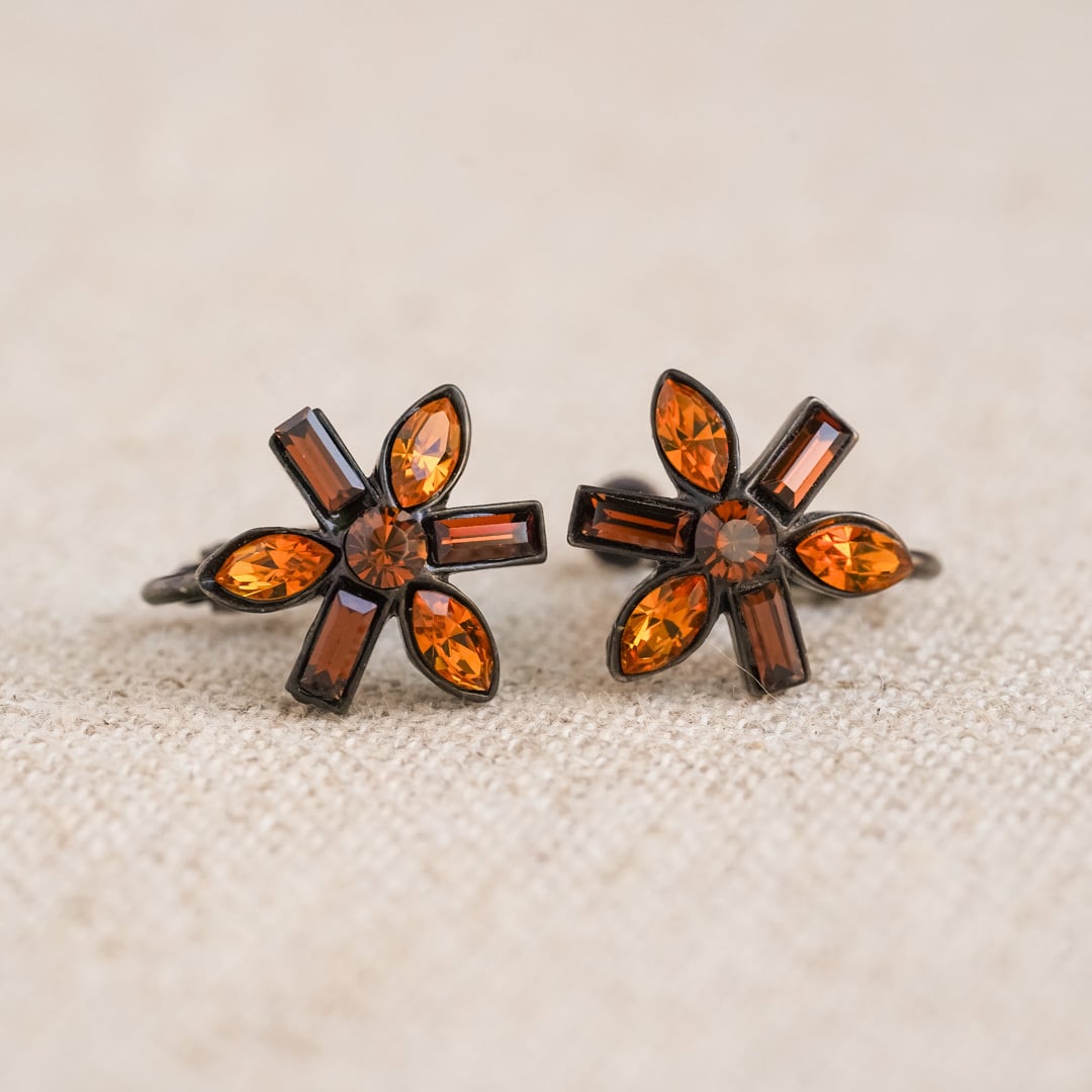 These vintage earrings feature deep amber-colored stones arranged like petals, combining marquise and baguette cuts for a strikingly dimensional design. With every shift of light, they reveal new facets, casting a warm, sophisticated glow around the face.