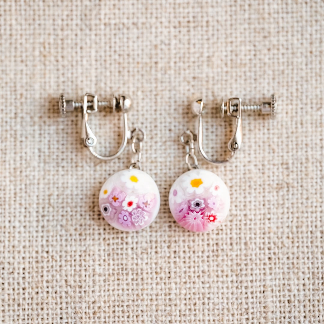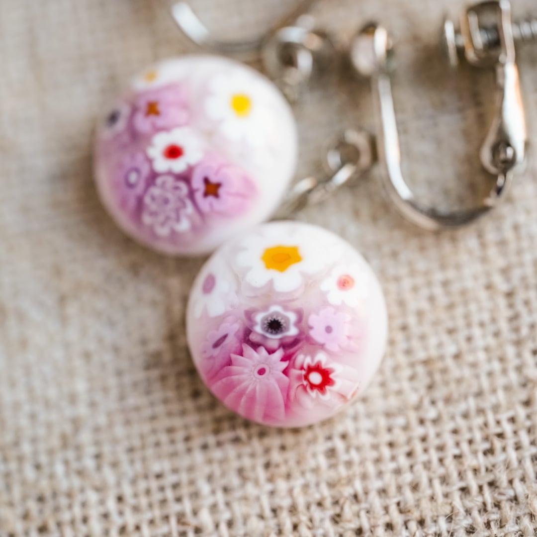 淡いピンクとホワイトのグラデーションに、愛らしい小花が咲き誇るヴェネチアンガラスのイヤリング。ミルフィオーリ(千の花)技法で一つひとつ丁寧に作られたガラスパーツは、職人が色ガラスの棒を重ねて模様を練り込み、高温で溶かして切り出すという、ヴェネツィア伝統の高度な技法によるものです。そのため、同じ柄は二つと存在せず、まるで小さなアートピースを耳もとに飾るような特別感があります。
