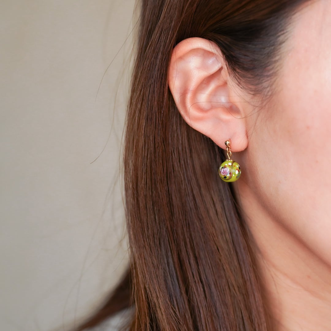 鮮やかなライムグリーンに、ピンクのバラとカラフルな点模様が踊るように浮かぶヴェネチアンガラスのピアス。まるで小さなキャンバスに描かれたアートを身につけるような特別感を放ちます。