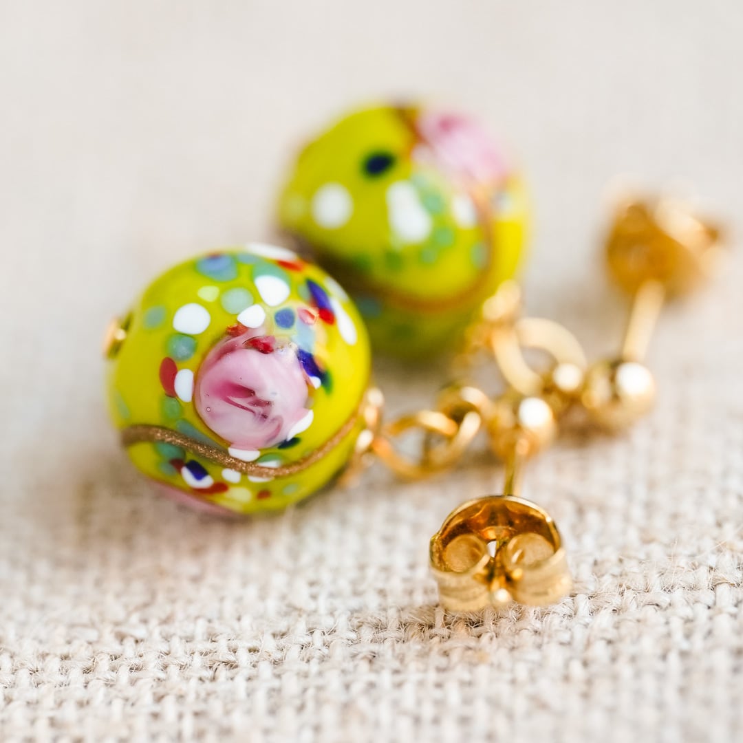 These Venetian glass earrings glow with a vivid lime green base, decorated with painterly pink roses and playful multicolored dots. They feel like miniature works of art—unique, expressive, and full of life.