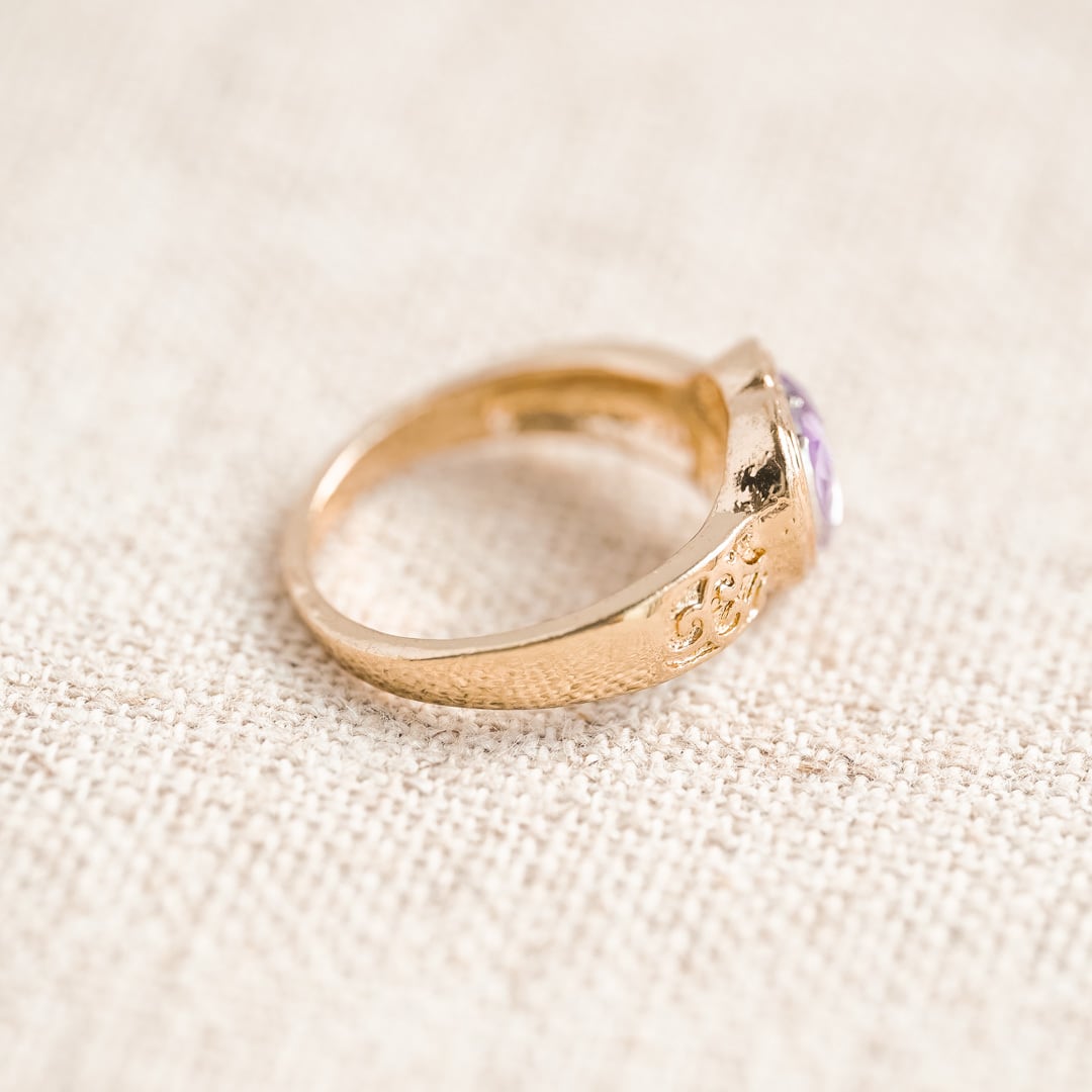 This vintage ring strikes a beautiful balance — a heart motif that feels refined rather than sweet, glowing with a quiet sophistication. The translucent purple stone catches the light gently, adding a serene radiance to the hand.