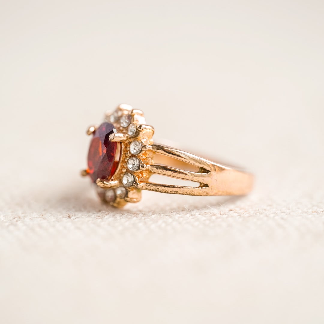 A vintage ring with a classic floral motif, featuring a deep red central stone encircled by clear accents that glimmer like petals. The ruby-like hue evokes the warmth of candlelight in winter—radiant yet serene.