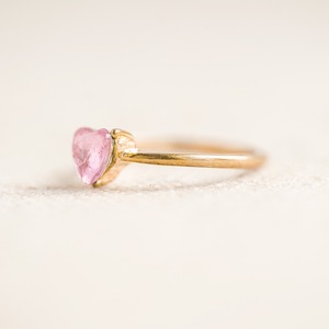やわらかなピンクの輝きをたたえたハートモチーフのヴィンテージリング。華奢なフォルムが指先をすっきりと見せ、甘すぎず、上品な存在感を放ちます。