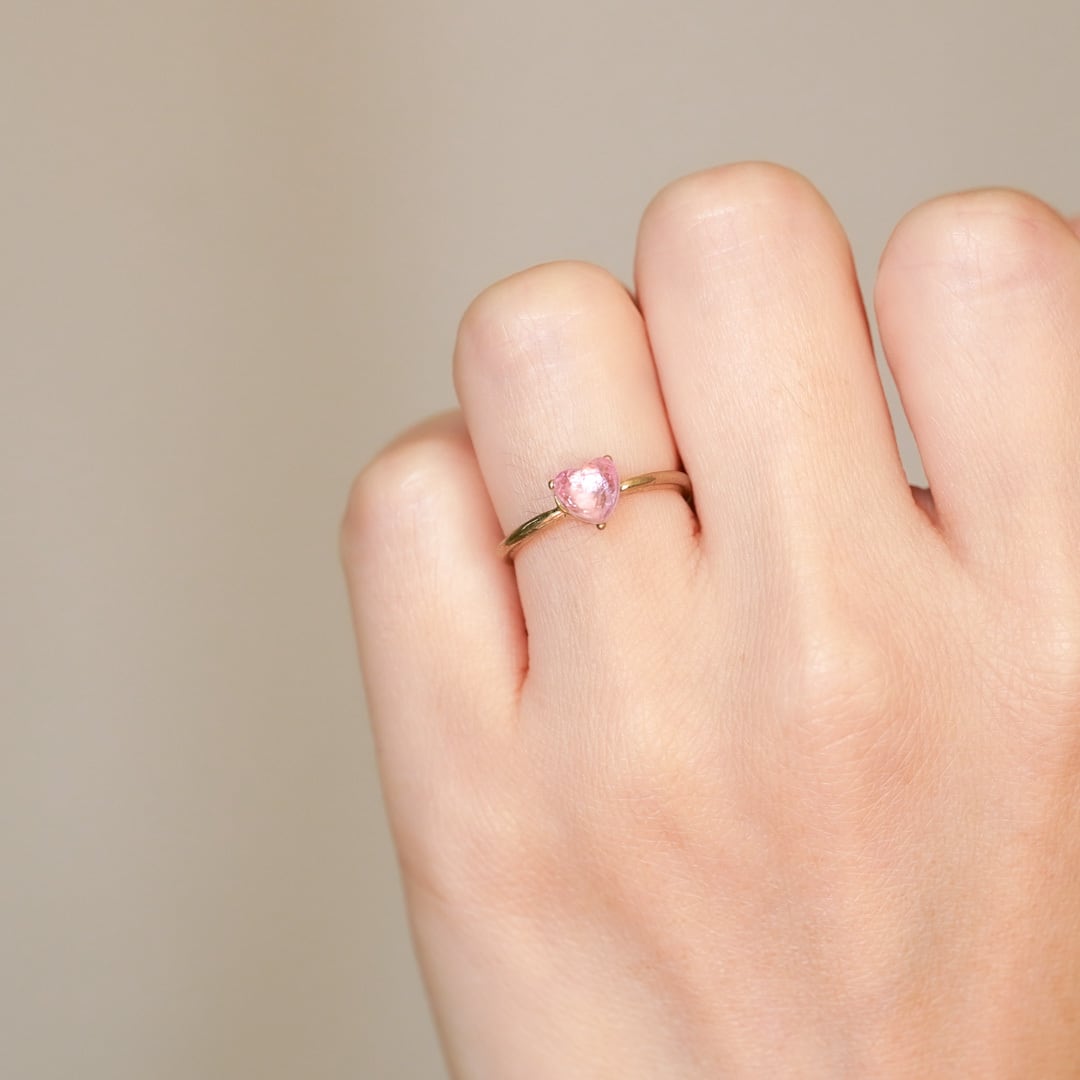 A vintage ring featuring a softly glowing pink heart stone, delicately set in a slender gold band. Its refined silhouette keeps the design from feeling overly sweet—balancing femininity with quiet sophistication.