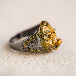 堂々としたライオンのレリーフが中央に配された、芸術的な存在感を放つメダリオンリング。