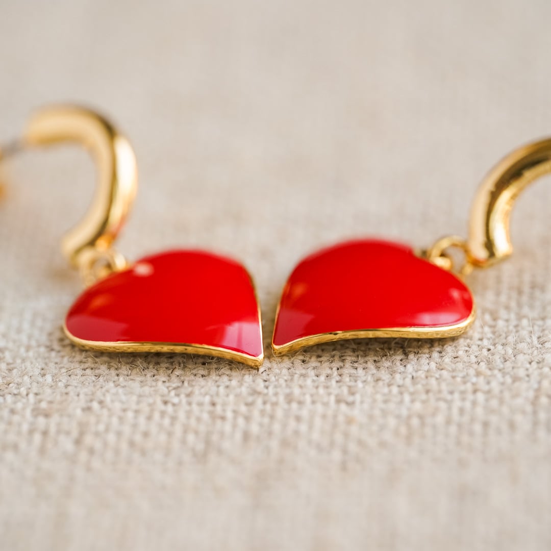 The softly rounded form gleams with layered reflections, creating a glass-like depth that catches the light beautifully. Suspended from elegant gold hoops, the hearts sway gently with each movement, adding a touch of rhythm and warmth to your look.