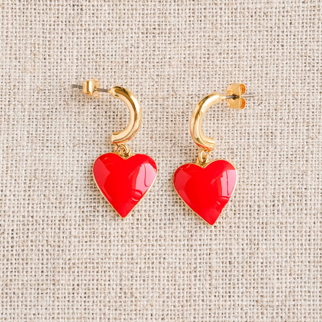 A pair of vintage heart earrings featuring vivid red enamel with a glossy, mirror-like finish.