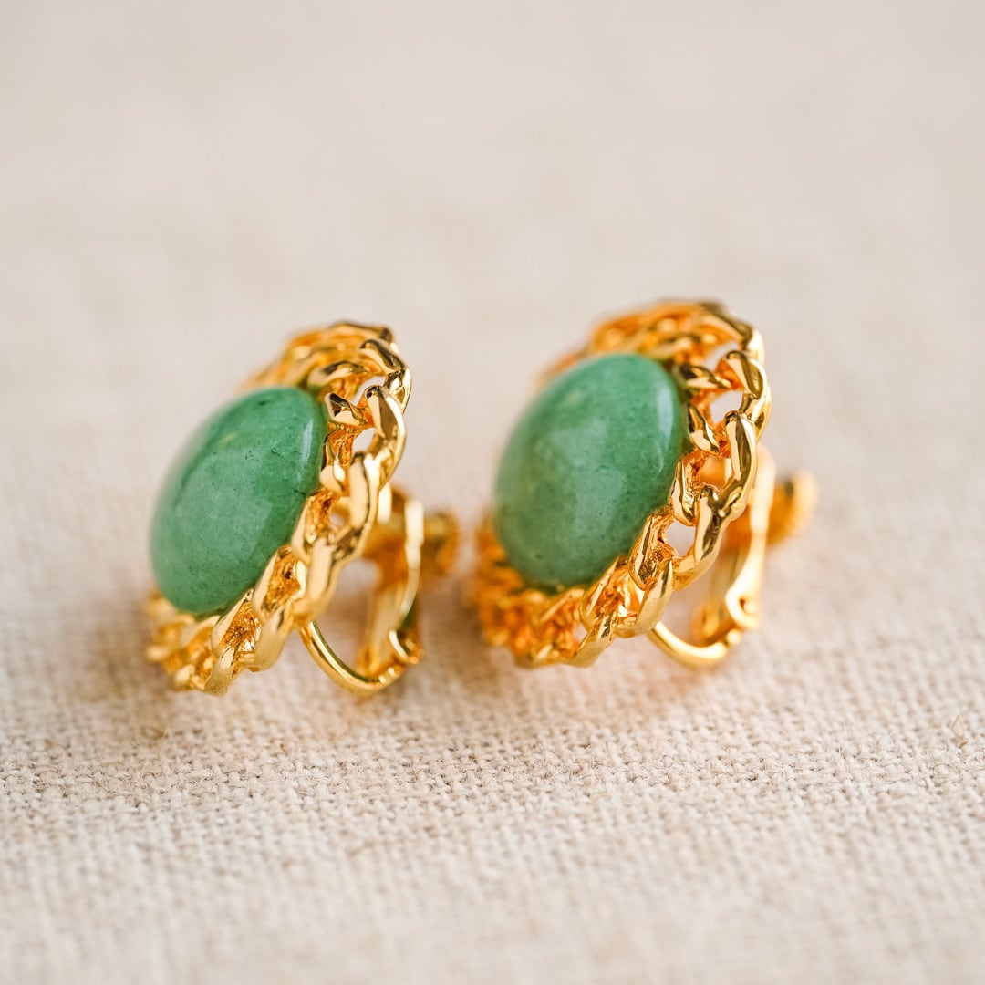 These vintage earrings feature luminous milky green cabochons framed in a finely linked gold chain setting, creating a balance of softness and strength. The semi-translucent stones capture light within their depths, shifting gently in tone as they move—like calm water touched by morning sun. The gold frame, crafted in an organic interlocking form, reflects light in subtle waves, accentuating the serene glow of the green stone. Both classic and contemporary, they lend a refined confidence to any look.