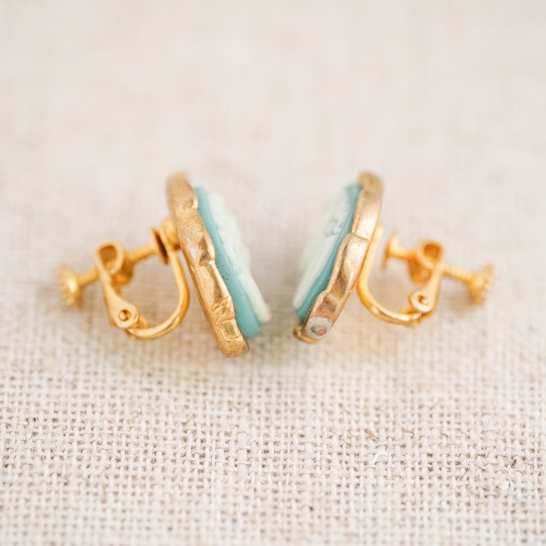 淡いグリーンとアイボリーのコントラストが美しい、ヴィンテージのカメオモチーフイヤリング。