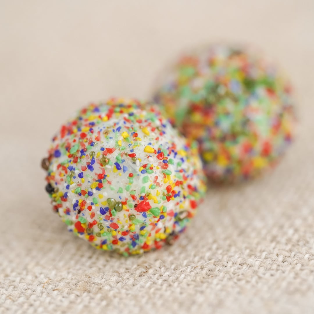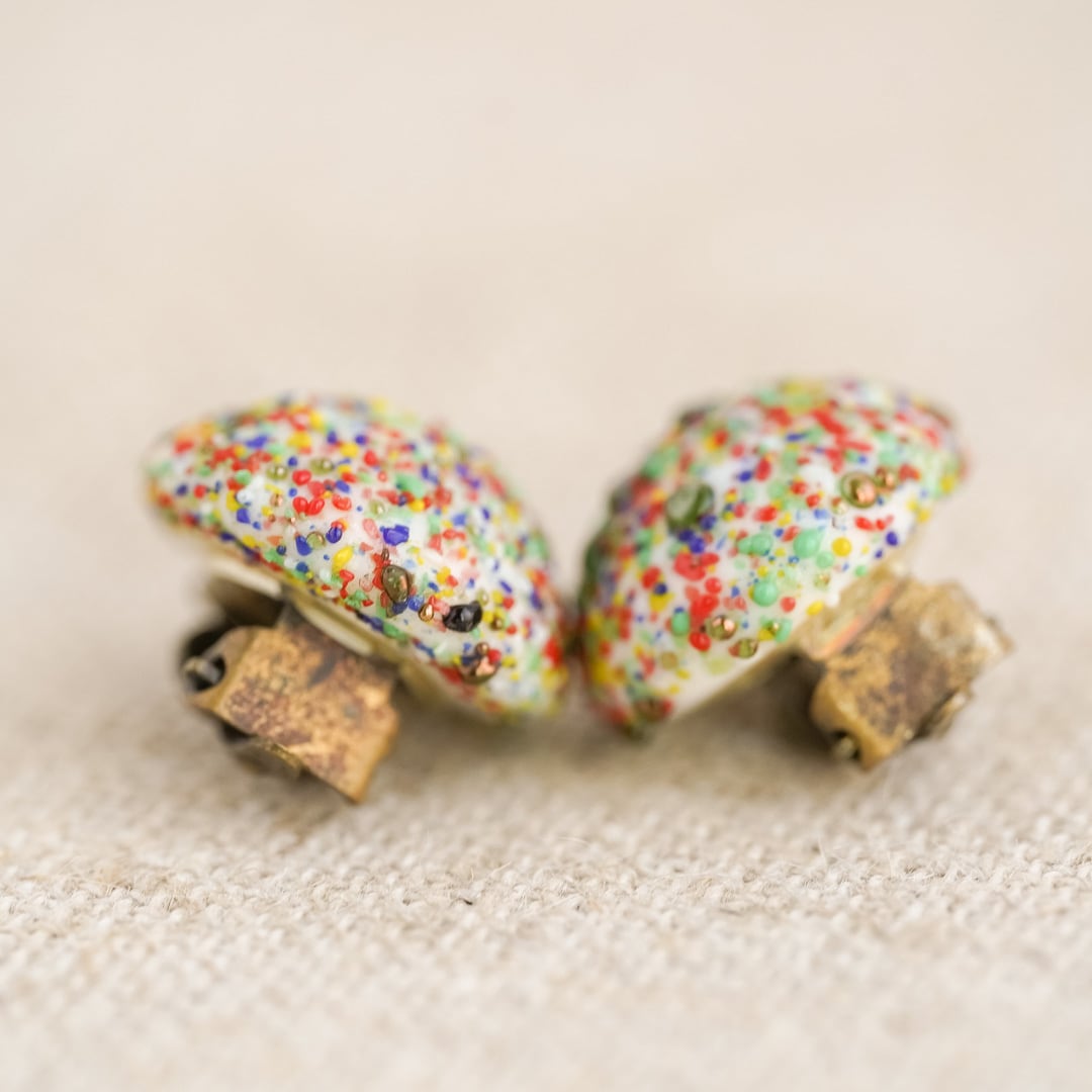 Each earring is handmade, featuring a dome of clear glass encasing countless vibrant specks of color. No two pieces are ever identical; each reflects the artisan’s hand and the spontaneity of molten glass. The result is a design that feels alive—sparkling subtly with movement, as though it holds a constellation within.