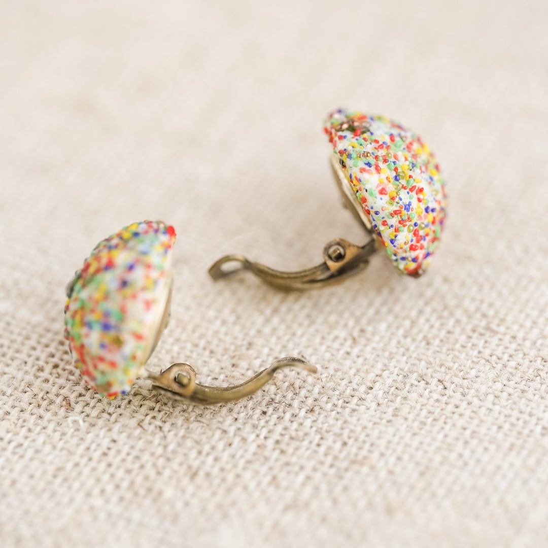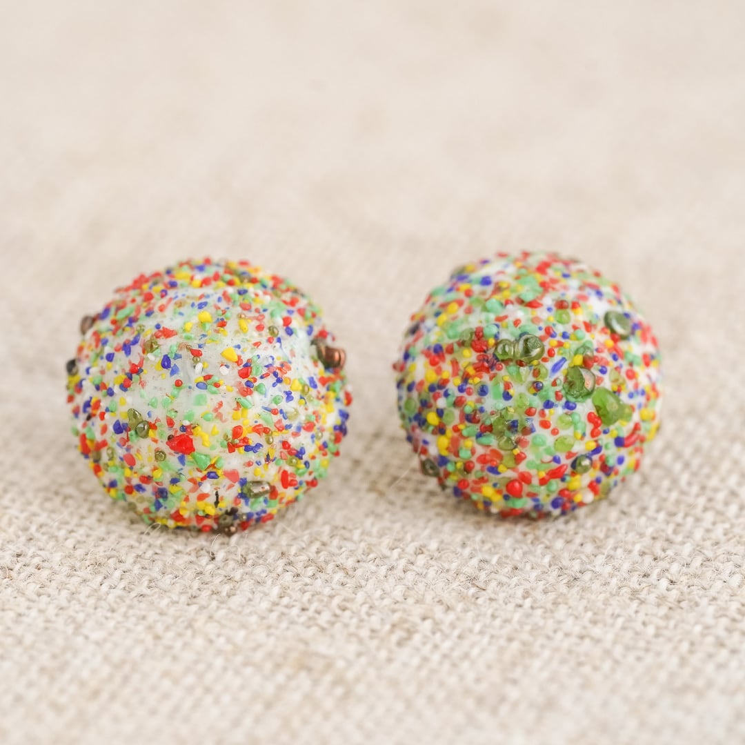 こちらのイヤリングは、透明なガラスの中に無数のカラフルな粒が封じ込められたデザイン。一つひとつが**職人の手作業で制作されており、同じものはふたつと存在しません。**光を受けるたびに異なる表情を見せ、まるで小さな宇宙のような奥行きを感じさせます。