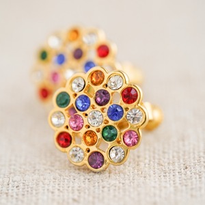 レッド、グリーン、ブルー、ピンク、クリア――色とりどりのラインストーンが規則的に並び、まるでホリデーオーナメントのように華やかに輝きます。ゴールドトーンのベースが温かみを添え、冬の装いにぬくもりと光を与えてくれるデザインです。