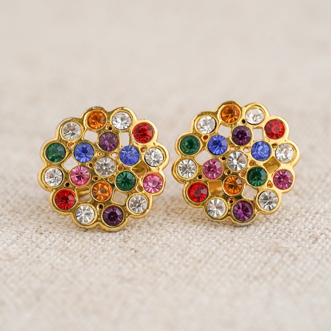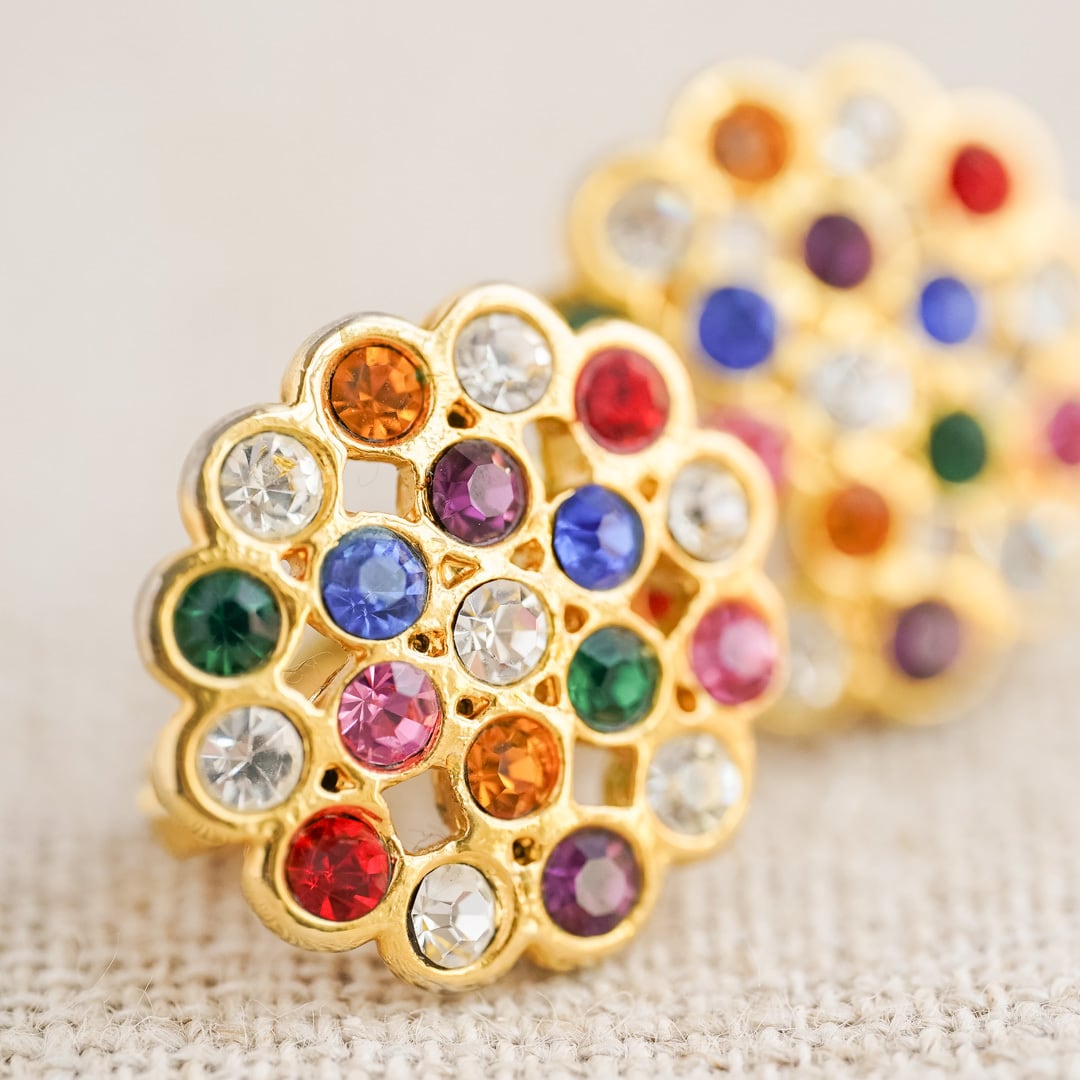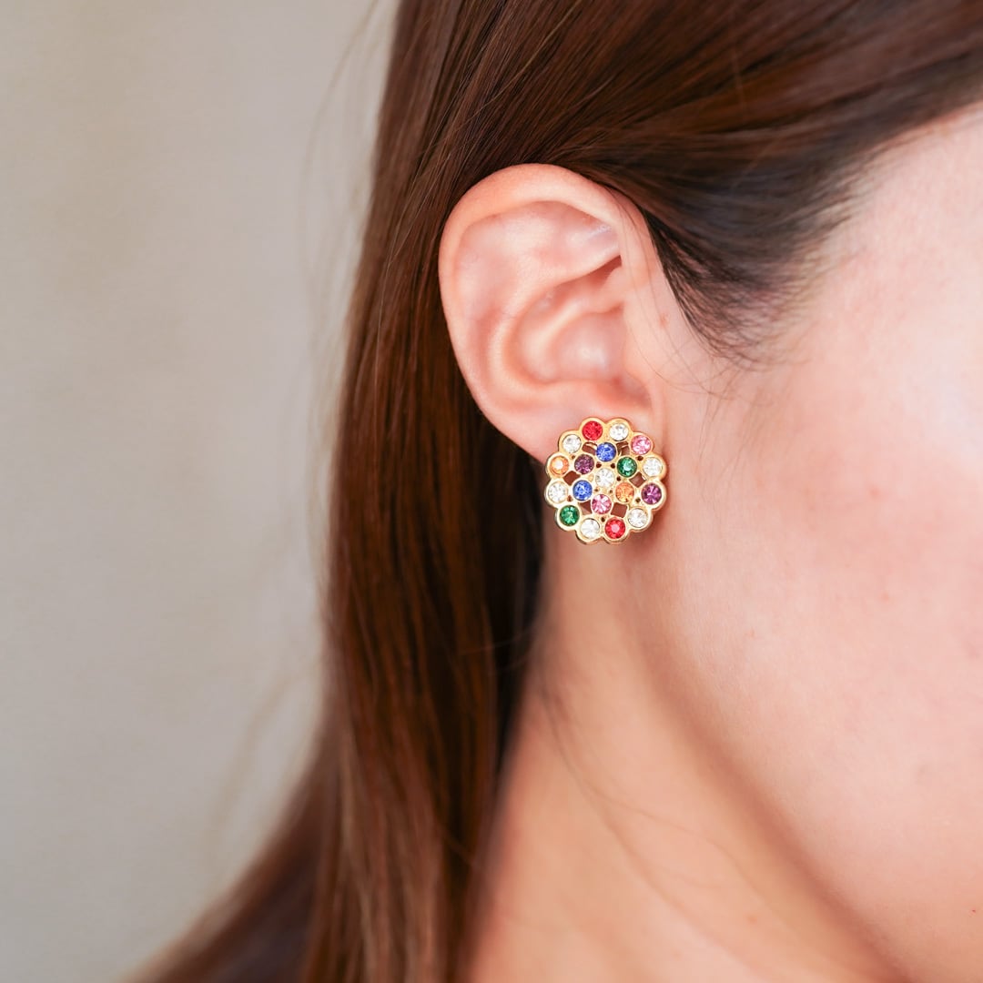 Each piece features a circular cluster of jewel-toned stones—ruby red, emerald green, sapphire blue, soft pink, and crystal white—arranged with perfect balance on a warm gold-tone base. Their brilliance recalls the glow of holiday ornaments, making them an ideal choice for the Christmas and holiday season.