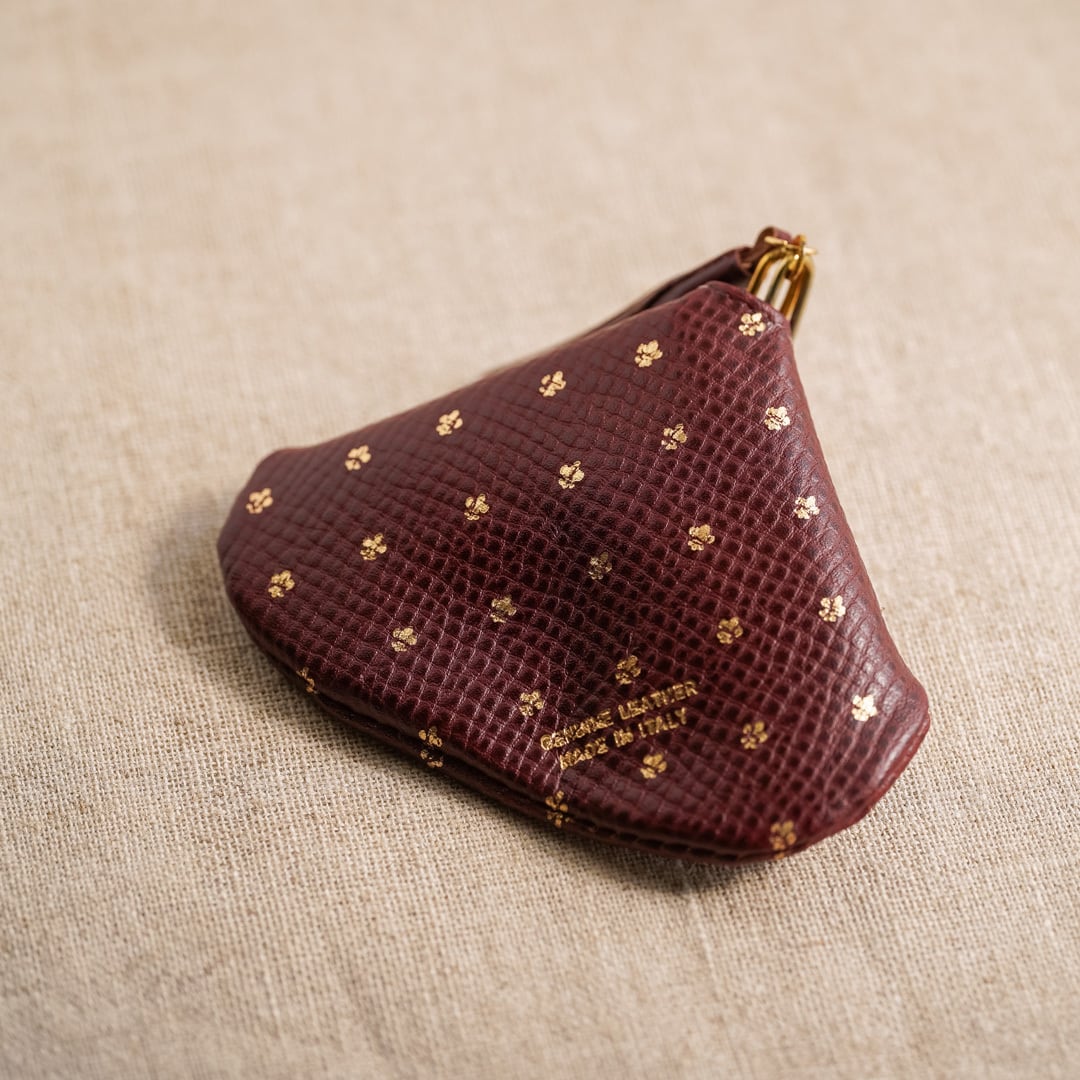 深いバーガンディの本革に、さりげなく型押しされたゴールドの小花模様。