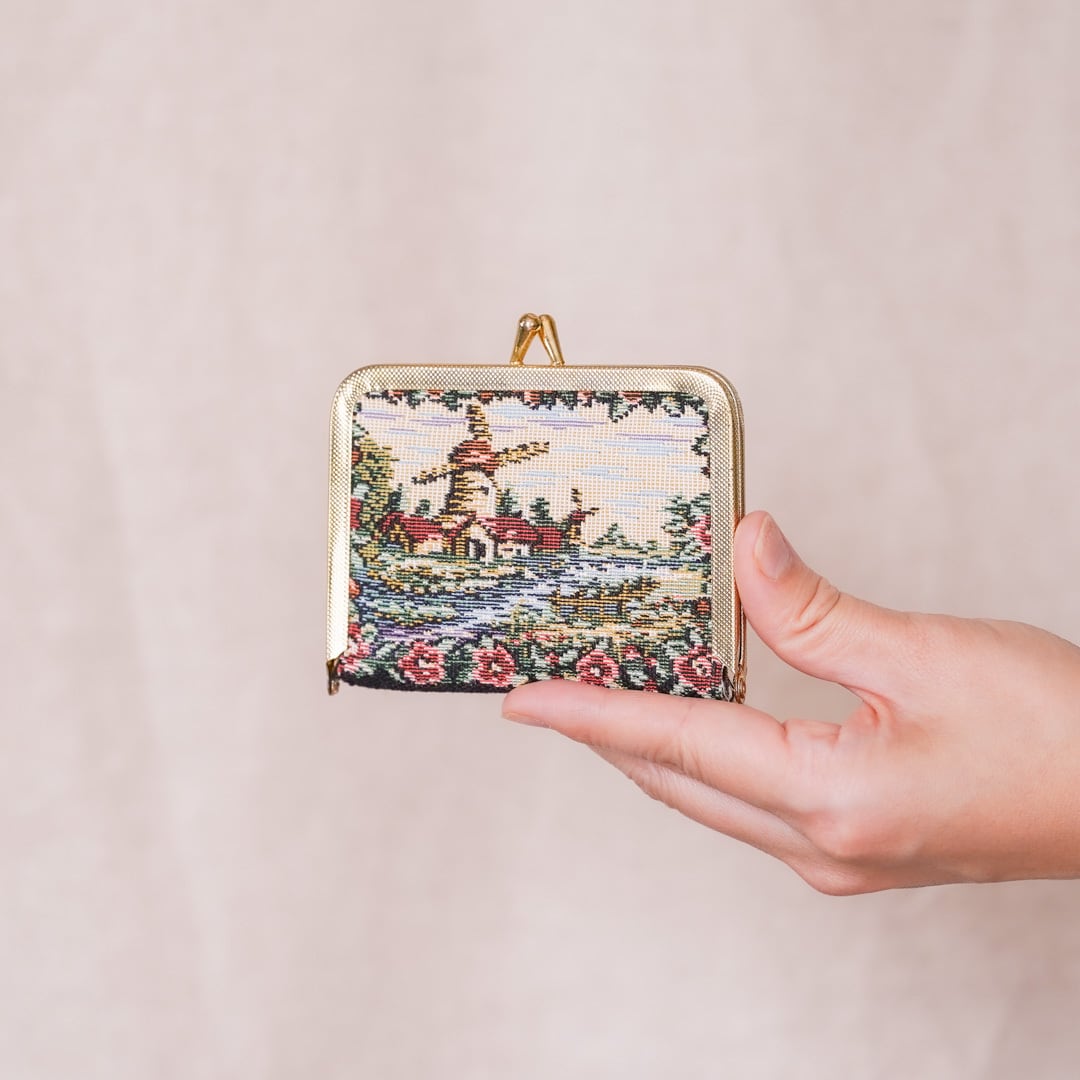 繊細なゴブラン織で描かれた、湖畔の風車と花々の情景。