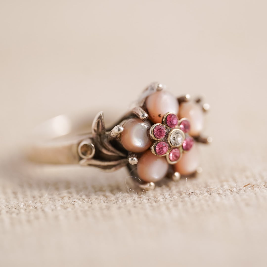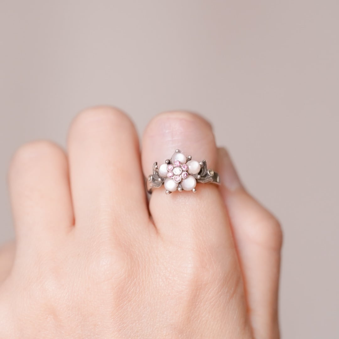 淡いミルキーピンクのストーンを花びらのように束ねた、