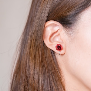 深いレッドのローズモチーフを、金属から一枚一枚ていねいに