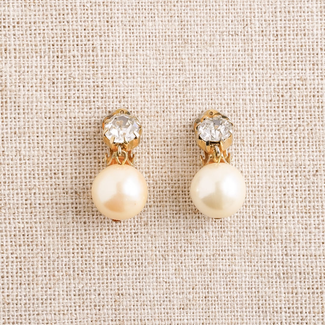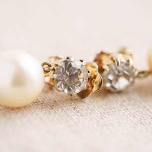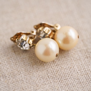 光を受けてやわらかに艶めくコスチュームパールと、上部にあしらわれたクリアストーンの輝きが美しいヴィンテージイヤリング。