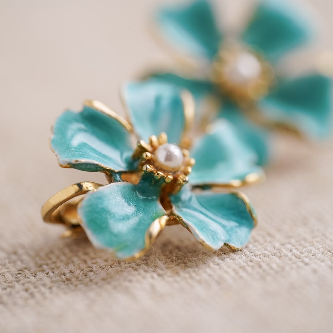 Soft mint-blue petals bloom gently at the ear — a vintage earring that captures the delicate light of spring.