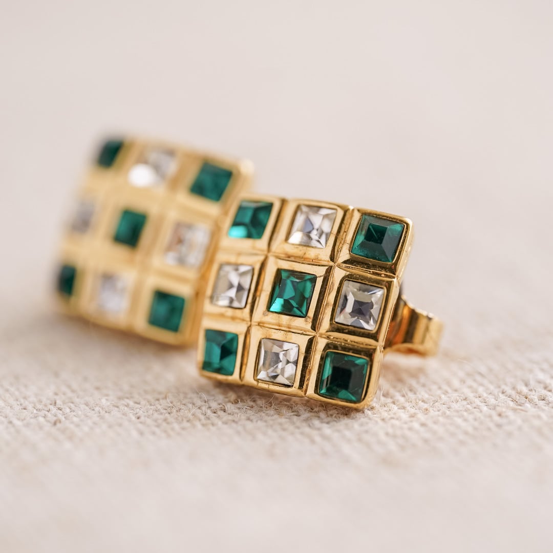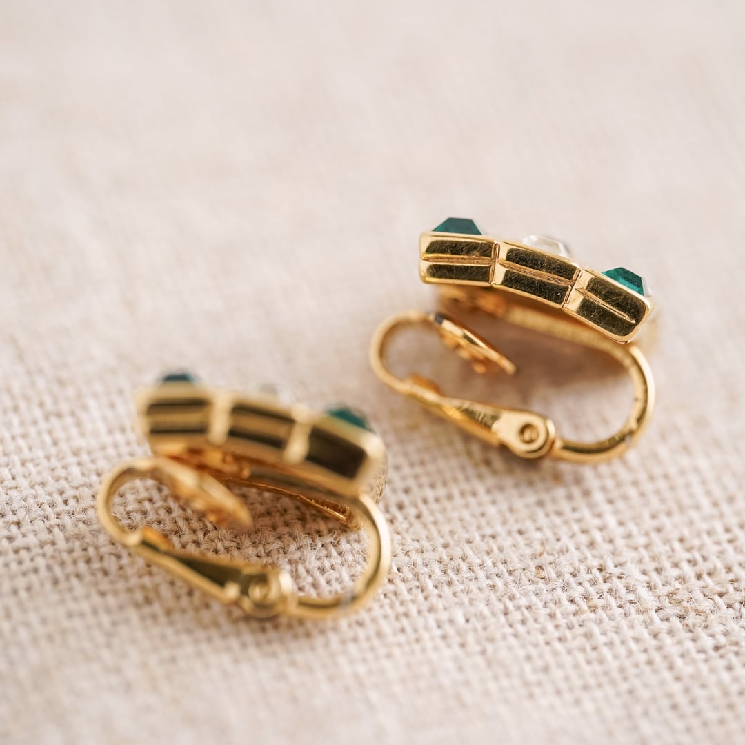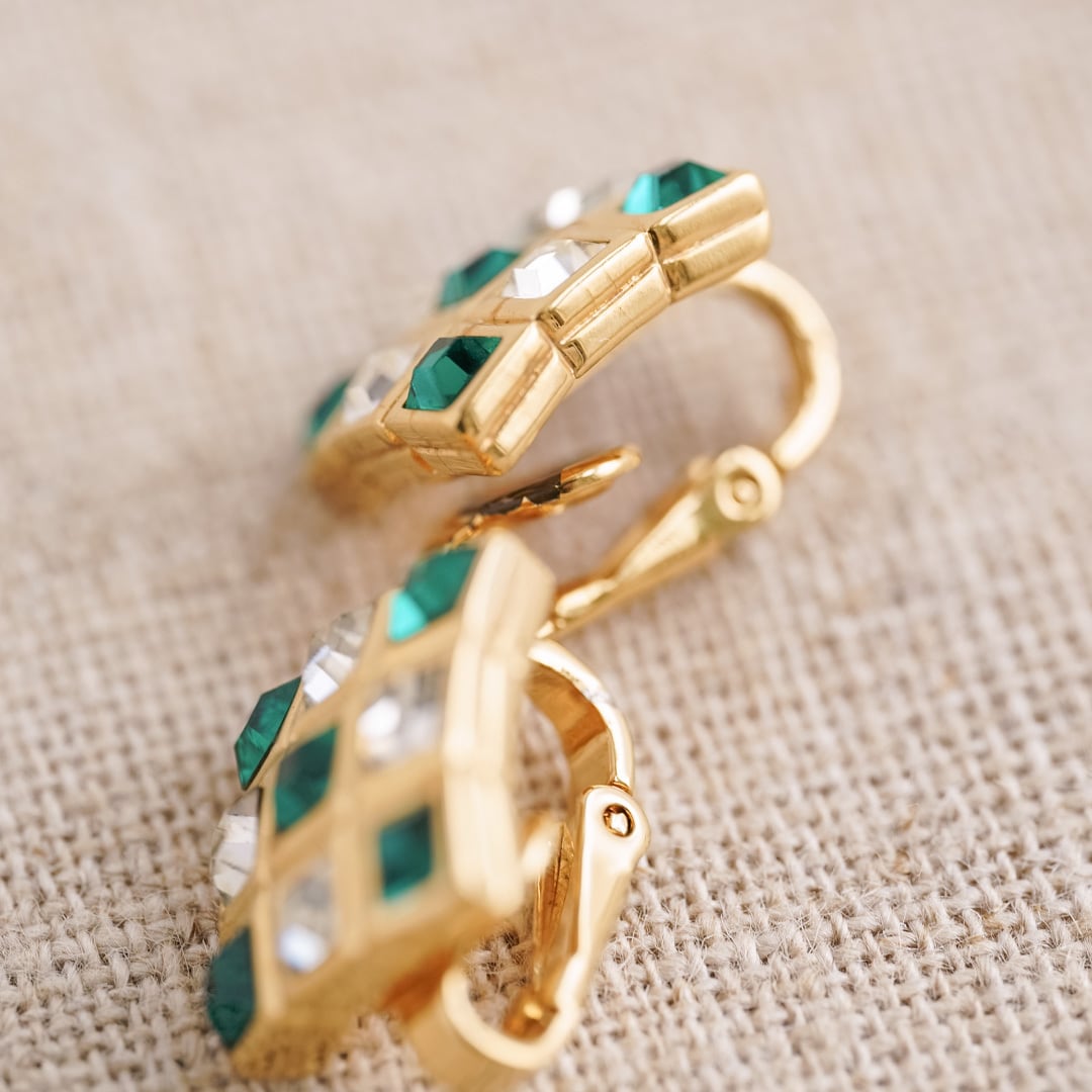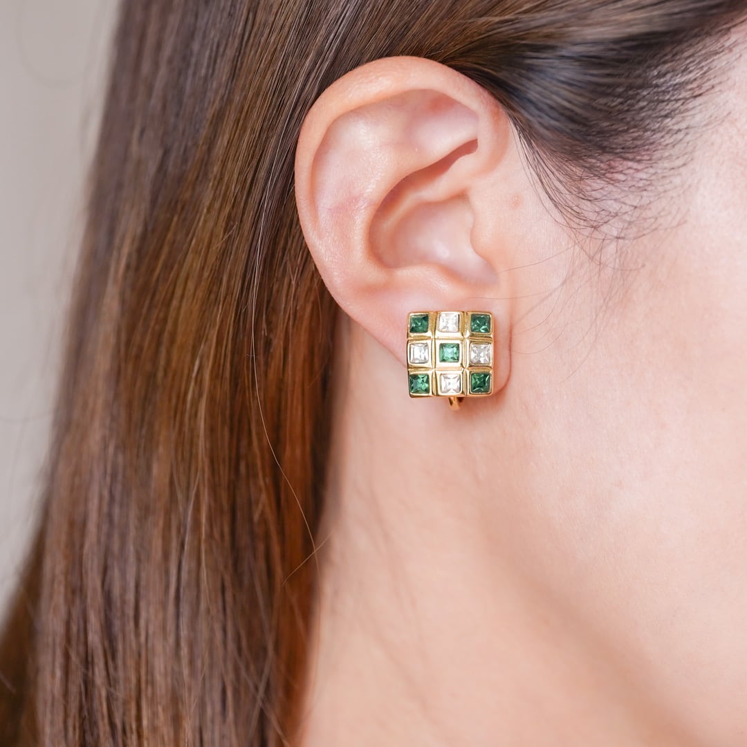 A refined harmony of emerald green and crystal — these vintage earrings capture the architectural elegance of Art Deco design. The precisely arranged grid of stones reflects light in subtle, shifting tones, creating a poised and intelligent radiance. Compact in size yet striking in presence, they lend both structure and softness to the face.
