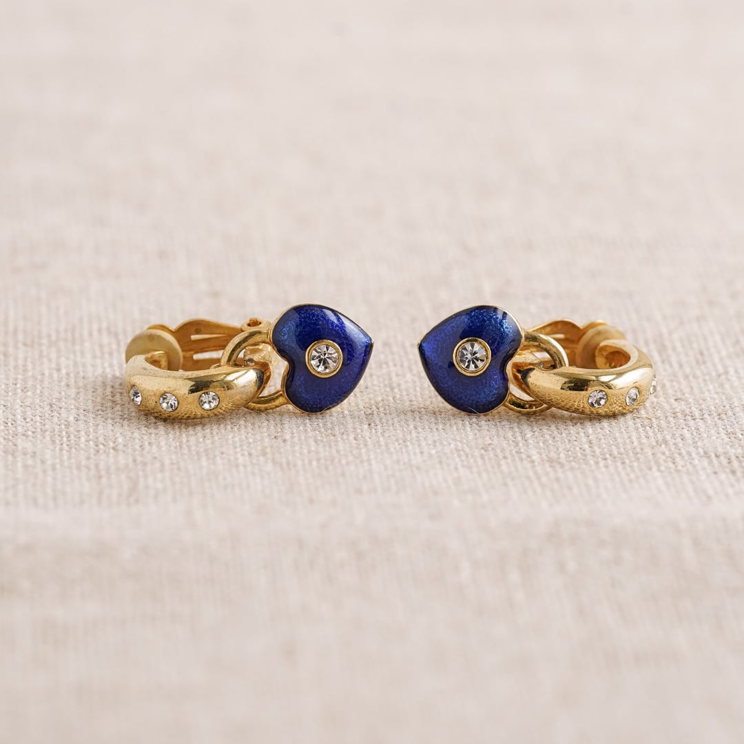 these vintage earrings reinterpret the heart motif with refined restraint. The small, gold-toned hoops carry delicate heart charms, each adorned with a crystal that catches the light softly with every movement.
