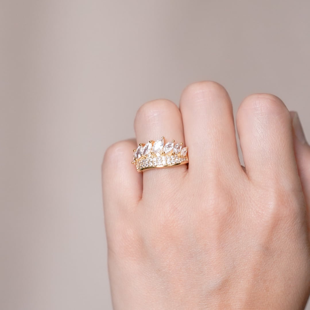 その構築的なデザインと、ゴールドの温かな輝きが重なり合い、指もとにモードな存在感を生み出します。
