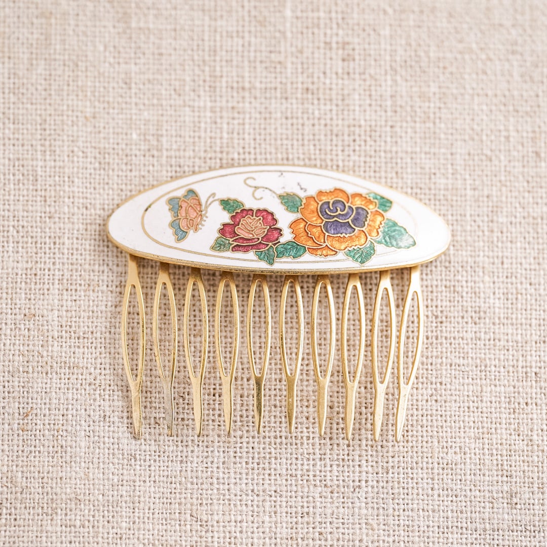 こちらのコームは、柔らかい白地に大輪の花と蝶が舞う、クラシックな意匠が魅力。