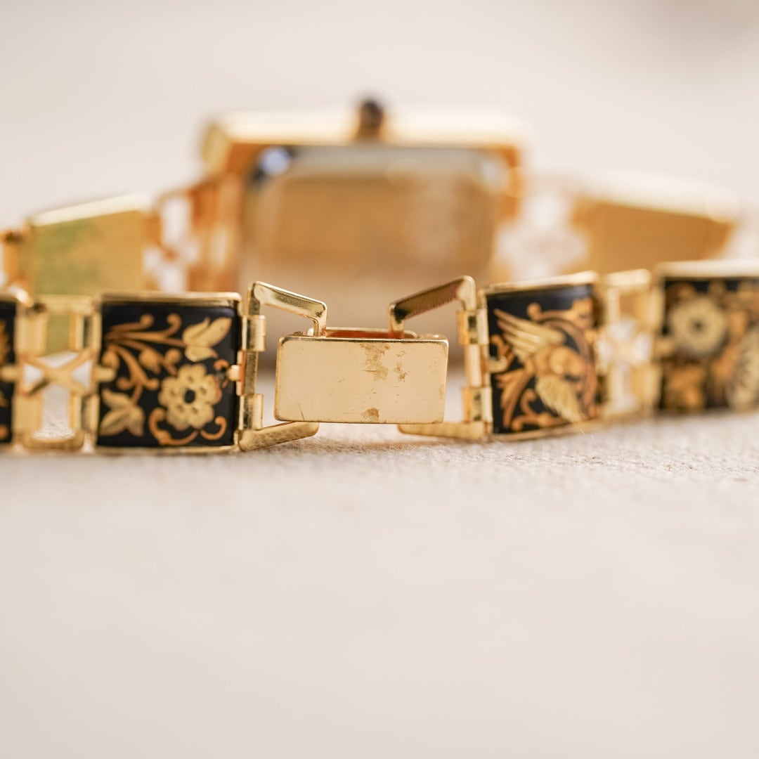 The rectangular gold-tone case is paired with a bracelet of black enamel panels, each meticulously inlaid with golden florals and doves.
