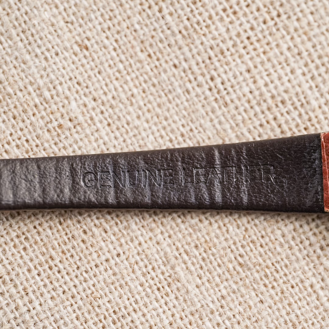 金色のラウンドケースと細身のブラウンレザーベルトが描くコントラストは、
