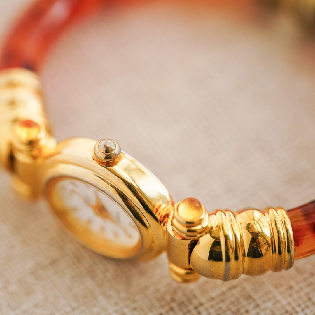 The translucent tortoiseshell acrylic shifts gently with the light, revealing layers of depth, while the ornate gold accents bring a touch of classical allure. Delicate yet confident, this watch elevates your mood every time it catches your eye—a small but impactful luxury for everyday life.