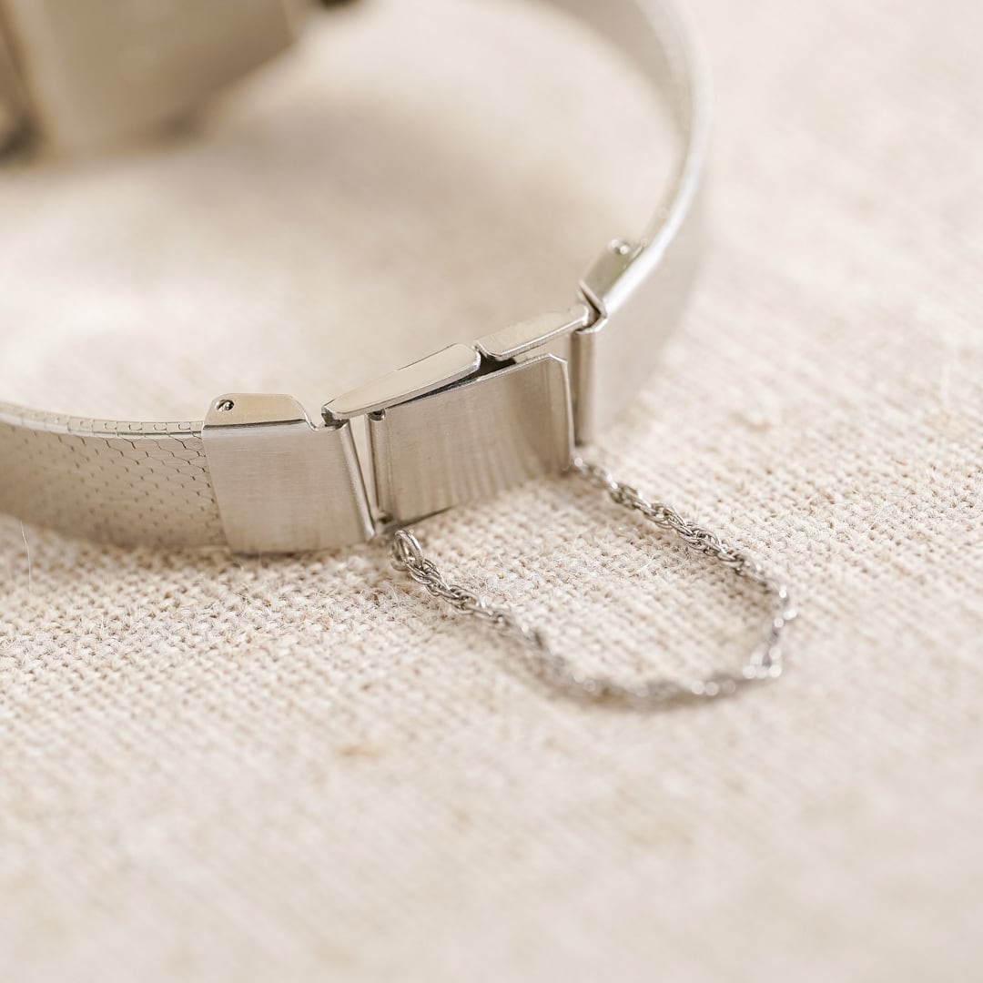 The square dial has a gentle, vintage glow, while the fluid mesh bracelet drapes around the wrist with a fabric-like suppleness. Its lightness and comfort are hallmarks of vintage mesh craftsmanship, rarely matched in contemporary models.